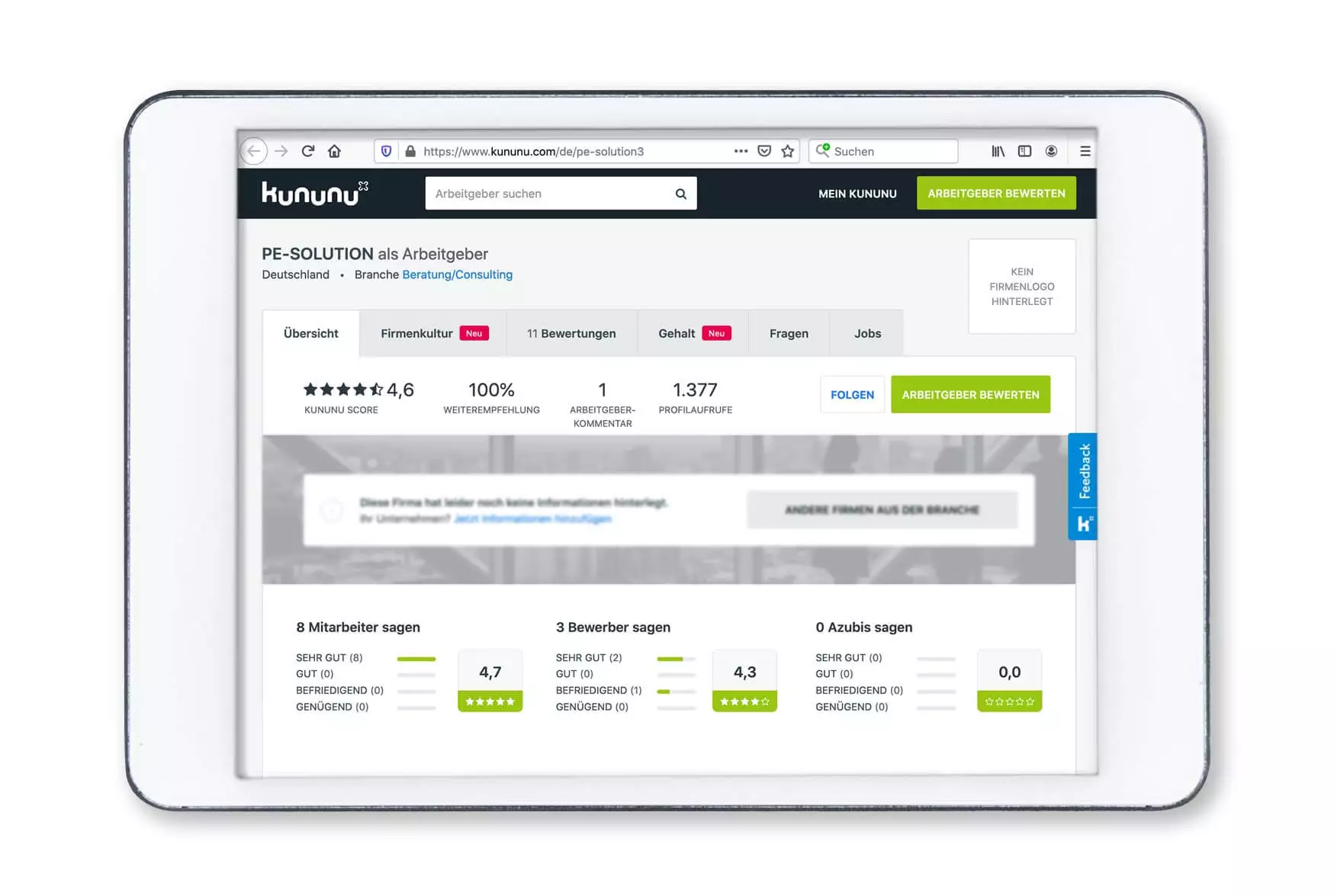 Transparenz und ein realistischer Einblick in unser Unternehmen sind uns sehr wichtig – deshalb heißen wir die Einträge in dem Arbeitgeberbewertungsportal Kununu herzlich willkommen. Wir sind nicht perfekt – sehen es aber als notwendig und wichtig an, unsere Mitarbeiter:innen und unsere internen Strukturen beständig weiterzuentwickeln. Kritik nehmen wir uns zu Herzen und leiten Lösungen daraus ab.